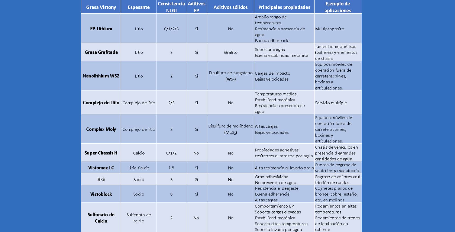 Hemos elaborado una tabla para ser usada como una guía rápida orientativa para la selección de grasas Vistony.