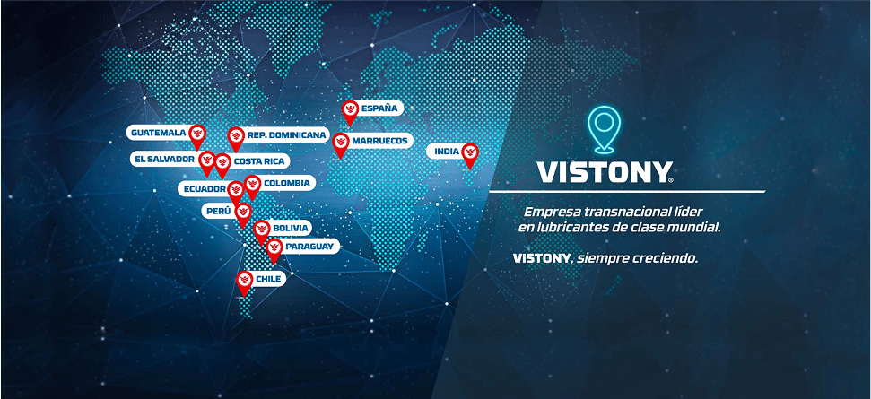 Vistony ha logrado ampliar su presencia en más de 18 países, con plantas de producción en Perú, Bolivia y Brasil. Nos sentimos orgullosos de tener presencia en a mercados internacionales, manteniendo siempre nuestro compromiso con la calidad y la innovación. Lubricantes de calidad para proteger los equipos industriales del país, siempre innovando y cerca de ti.